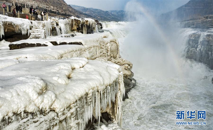 1月12日,冰雪下的黃河壺口瀑布在晨光中顯現(xiàn)一道美麗的彩虹(無(wú)人機(jī)照片)。新華社記者陶明攝