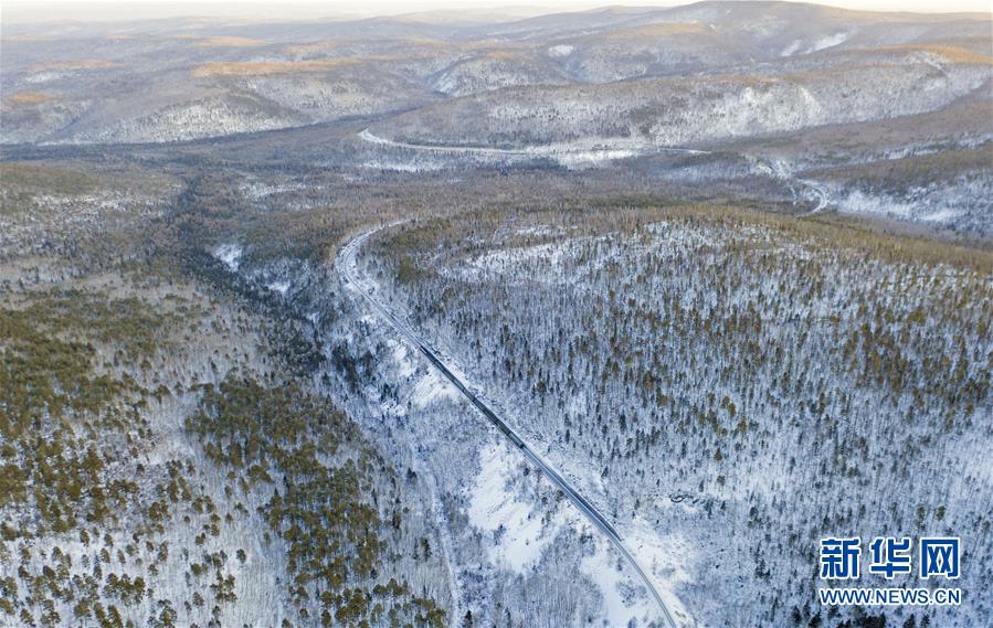 1月6日,一輛列車穿行在西羅奇維修工隊(duì)管區(qū)的林海雪原上(無(wú)人機(jī)照片)。新華社記者才揚(yáng)攝