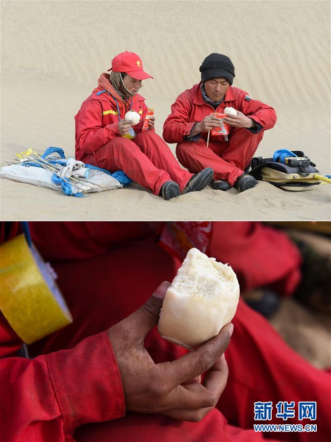 這是一張拼版圖片:上圖為測(cè)量工周國(guó)燕(左)和丈夫杞朝金在沙漠中解決午餐(1月13日攝);下圖為測(cè)量工周國(guó)燕在吃冰涼的饅頭(1月13日攝)。地球物理勘探是油氣開發(fā)的第一步,相當(dāng)于給地球做CT。物探工人按照嚴(yán)格的測(cè)線部署,在相應(yīng)位置鉆井,然后實(shí)施地震,采集地震波數(shù)據(jù)??蒲腥藛T通過數(shù)據(jù)組成的“CT片”,就能夠清晰地“看”到地下的地質(zhì)結(jié)構(gòu),判斷哪里埋藏有石油或者天然氣。2019年10月,東方地球物理勘探有限責(zé)任公司塔里木物探處2113隊(duì)進(jìn)入新疆塔克拉瑪干沙漠腹地,開始中古14-21、塔中2兩個(gè)區(qū)塊的三維地震勘探。近2000名物探工人將在1000平方公里的范圍內(nèi)一直工作到2020年4月,這也意味著他們將在塔克拉瑪干沙漠腹地連續(xù)度過第14個(gè)除夕夜。蘊(yùn)藏著豐富石油天然氣資源的新疆塔克拉瑪干沙漠有“死亡之?!敝Q,氣候干燥,年降水量在50毫米以下,冬季地表最低溫度超過零下30攝氏度,是世界油氣勘探難度最大的地區(qū)之一。為避開風(fēng)季,物探工人每年9、10月份進(jìn)入沙漠,一直工作到來年4月,夜以繼日與黃沙、嚴(yán)寒為伴,用辛勤的汗水,為祖國(guó)找油找氣。新華社記者丁磊攝