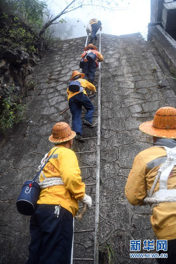 1月14日,百色工務(wù)段白水河橋隧工區(qū)班組成員攀梯上山開展巡查工作。在中國鐵路南寧局集團(tuán)公司百色工務(wù)段白水河橋隧工區(qū),有一個由14名工人組成的班組。他們常年像“爬山虎”一樣行走攀爬在地形險峻、云霧繚繞的高山上,負(fù)責(zé)南昆鐵路轄區(qū)路段的搜山掃石工作,清除一切可能危害鐵路行車安全的因素,保障旅客出行安全。新華社記者張愛林?jǐn)z