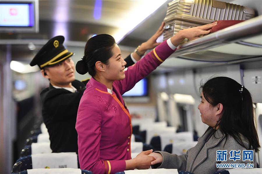 吉如(左)將盲人旅客吳瀟護(hù)送上車后,與列車長進(jìn)行交接(1月15日攝)。 新華社記者 陶明 攝