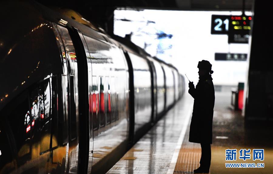 吉如在西安北站站臺(tái)上,與檢票口客運(yùn)人員聯(lián)控(1月14日攝)。今年春運(yùn)列車開行密度大,站臺(tái)崗位人員緊張,吉如時(shí)常被調(diào)到站臺(tái)進(jìn)行站臺(tái)服務(wù)工作。 新華社記者 陶明 攝