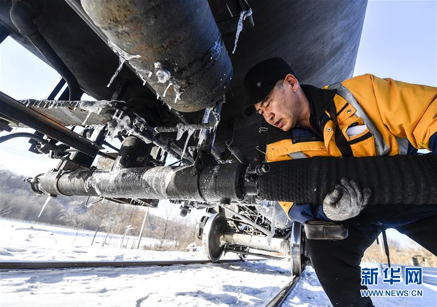 送水員黃衛(wèi)東將輸水管連接到蓄水車的出水口(1月17日攝)。新華社記者 許暢 攝