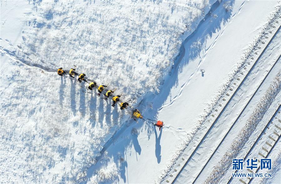 1月7日,西羅奇維修工隊(duì)工作人員在雪地上寫下“一路平安”為經(jīng)過的列車旅客送上祝福(無人機(jī)照片)。新華社記者王毓國攝