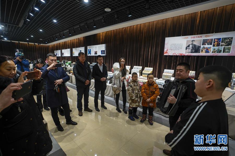 在塔城市手風(fēng)琴博物館,當(dāng)?shù)匚乃噽?ài)好者為游客演奏手風(fēng)琴(1月21日攝)。新華社記者 趙戈 攝
