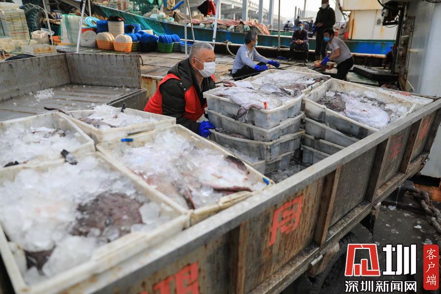 2020年2月24日,浙江舟山國際水產(chǎn)城碼頭,當(dāng)?shù)氐墓と苏趧偪堪兜臐O船上卸魚貨,現(xiàn)場(chǎng)十分繁忙。
