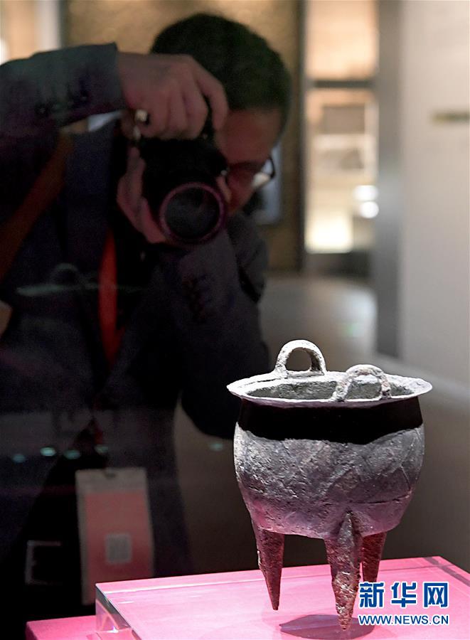 參觀者在二里頭夏都遺址博物館拍攝展品“乳釘紋銅爵”(2019年10月19日攝)。新華社記者李安攝