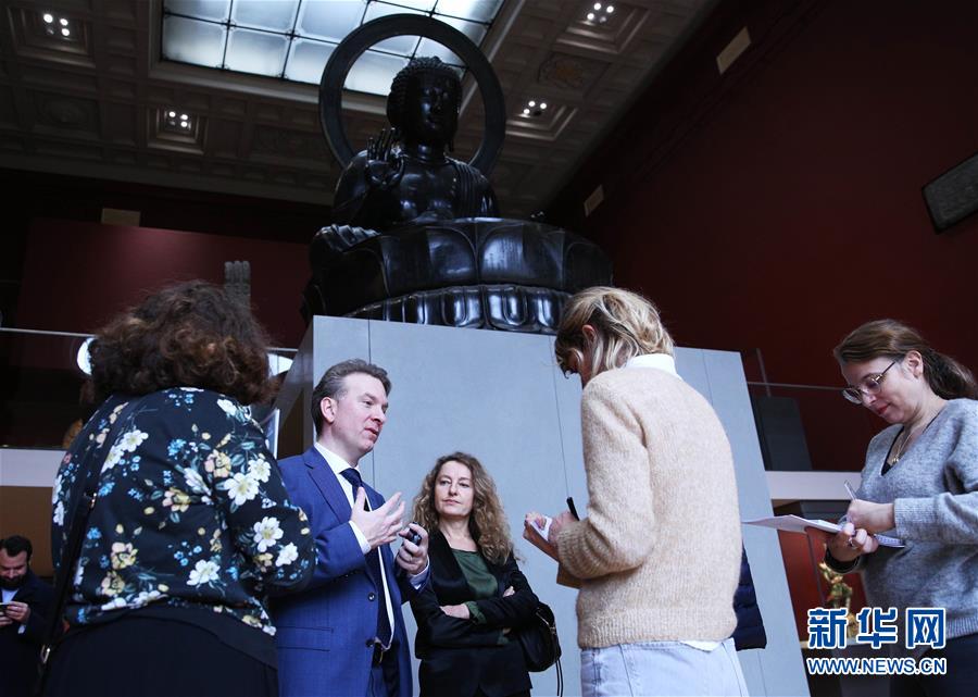 3月2日,在法國(guó)巴黎,賽努奇亞洲藝術(shù)博物館館長(zhǎng)埃里克·勒菲弗(左二)接受媒體采訪。 新華社記者 高靜 攝