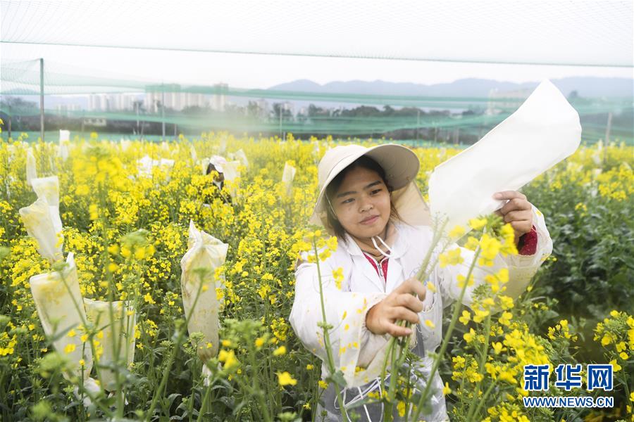 3月5日,工人在重慶市油菜工程技術(shù)研究中心油菜試驗(yàn)田內(nèi)給油菜花套袋。時(shí)下正值油菜花期,重慶市油菜工程技術(shù)研究中心的農(nóng)學(xué)專家?guī)ьI(lǐng)學(xué)生和技術(shù)工人搶抓農(nóng)時(shí),推進(jìn)油菜科研和育種工作。新華社記者 王全超 攝