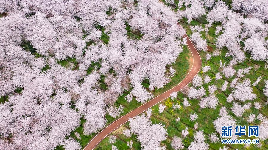 3月12日拍攝的貴安新區(qū)櫻花觀光園風景(無人機照片)。 近日,貴州省貴安新區(qū)櫻花觀光園內(nèi)櫻花競相盛開,花團錦簇間春意盎然。據(jù)介紹,疫情防控期間,為避免人群聚集,櫻花園暫不接待游客。 新華社記者 陶亮 攝