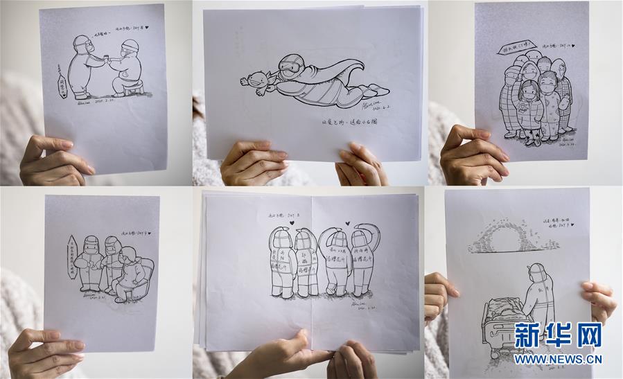 3月13日,黎婧展示自己在疫情期間創(chuàng)作的插畫(拼版照片)。 3月12日,插畫師黎婧和84位病友離開自己居住的武漢軟件工程職業(yè)學(xué)院康復(fù)驛站,回到自己家中。他們都是治愈出院的新冠病毒肺炎患者,已經(jīng)在武漢軟件工程職業(yè)學(xué)院康復(fù)驛站進(jìn)行了14天醫(yī)學(xué)觀察,達(dá)到醫(yī)學(xué)標(biāo)準(zhǔn),成功解除隔離。他們由專車運(yùn)送至所屬社區(qū)附近的集散點(diǎn)后,在社區(qū)工作人員的陪同下回家。 新華社記者 肖藝九 攝