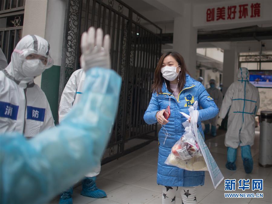 3月12日,黎婧到家后與小區(qū)網(wǎng)格員揮手告別。 3月12日,插畫師黎婧和84位病友離開自己居住的武漢軟件工程職業(yè)學(xué)院康復(fù)驛站,回到自己家中。他們都是治愈出院的新冠病毒肺炎患者,已經(jīng)在武漢軟件工程職業(yè)學(xué)院康復(fù)驛站進(jìn)行了14天醫(yī)學(xué)觀察,達(dá)到醫(yī)學(xué)標(biāo)準(zhǔn),成功解除隔離。他們由專車運(yùn)送至所屬社區(qū)附近的集散點(diǎn)后,在社區(qū)工作人員的陪同下回家。 新華社記者 肖藝九 攝