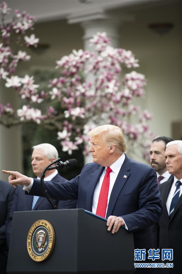 3月13日,美國總統(tǒng)特朗普(中)在華盛頓白宮的記者會上講話。特朗普當(dāng)天下午在白宮發(fā)表講話時正式宣布“國家緊急狀態(tài)”。他說,此舉旨在讓美國聯(lián)邦政府全力投入到抗擊新冠肺炎疫情的努力中。這項舉措將釋放500億美元資金,幫助各州和地方政府應(yīng)對疫情。新華社記者劉杰攝