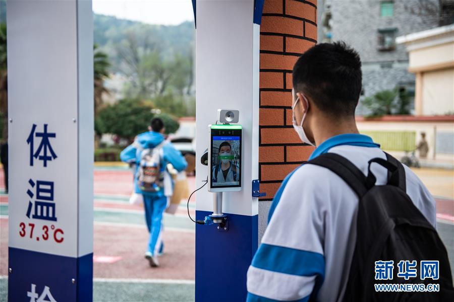 3月15日,烏當中學高三學生在校門處測量體溫。 當日,貴陽市烏當中學部分高三學生有序返校,準備恢復上課。據(jù)悉,貴州省高三年級和初三年級學生將于3月16日正式開學。 新華社記者 陶亮 攝