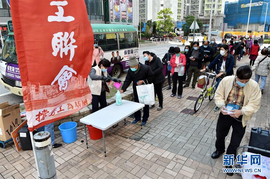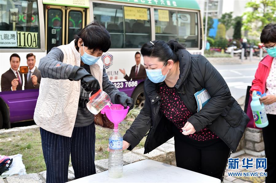 2月23日,市民領(lǐng)取消毒清潔劑。在將軍澳向市民免費(fèi)派發(fā)消毒清潔劑。當(dāng)日,香港工聯(lián)會新華社記者盧炳輝攝