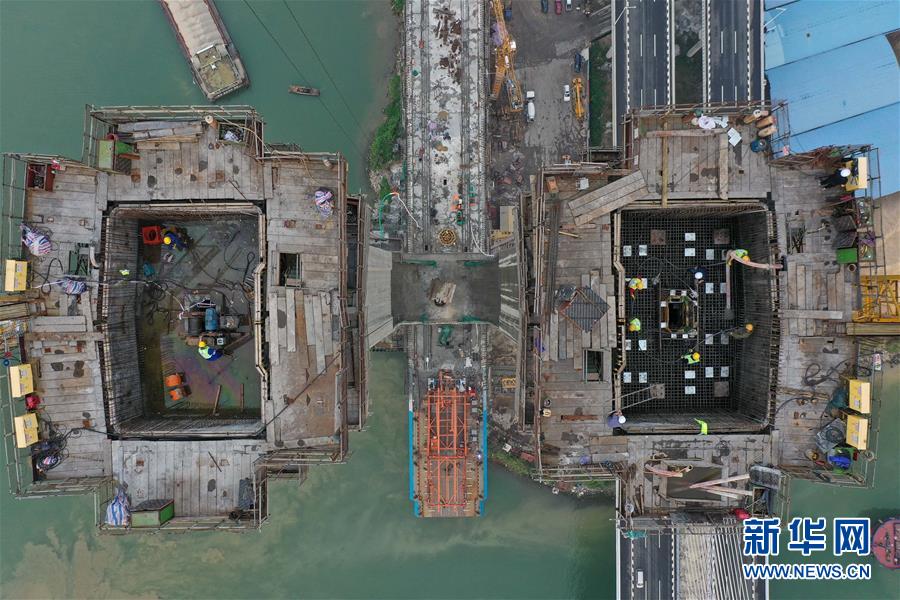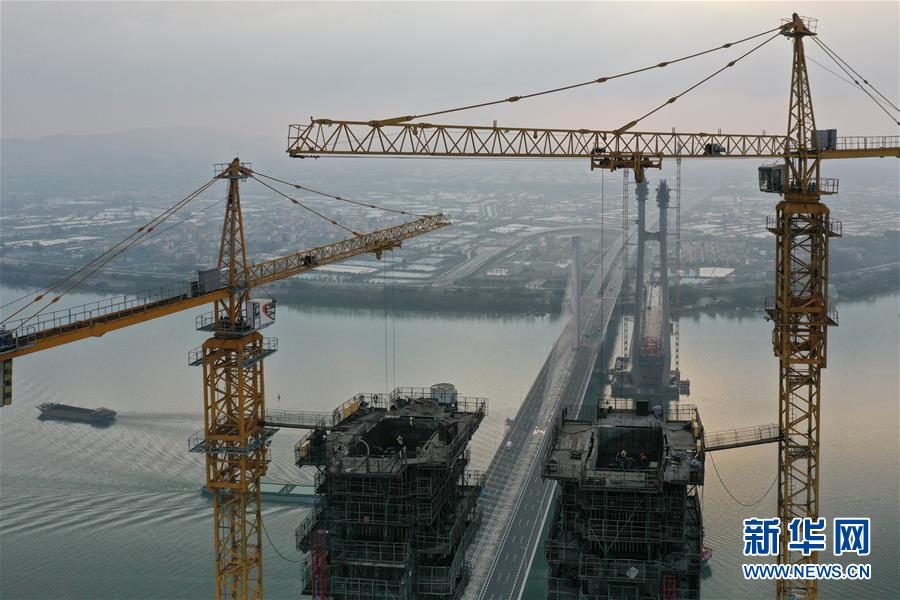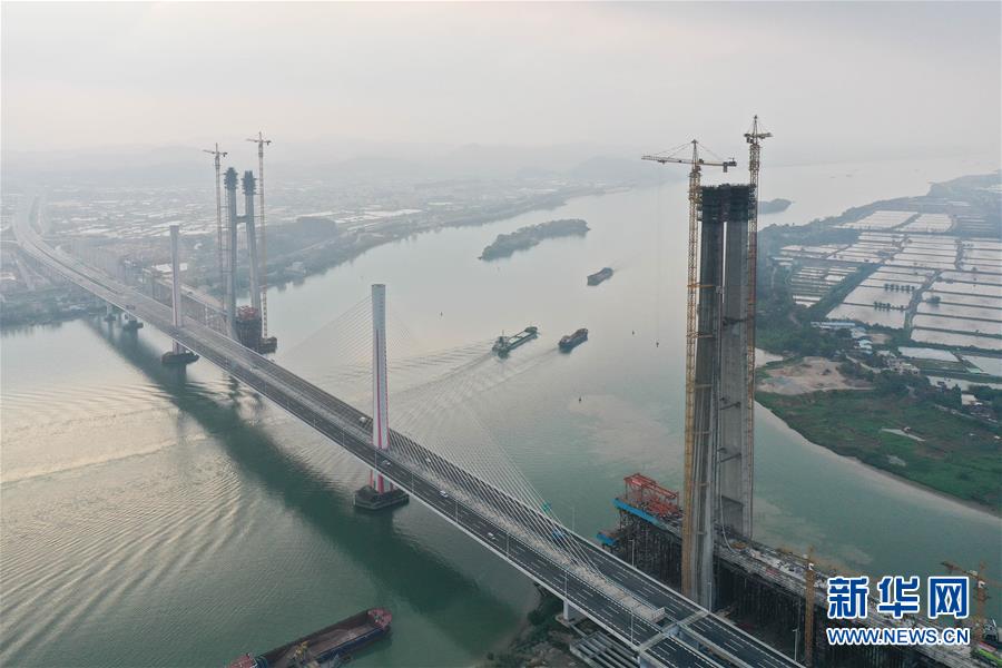 3月18日拍攝的廣州南沙港鐵路跨西江斜拉橋主塔封頂施工現(xiàn)場(chǎng)(無人機(jī)照片)。當(dāng)日,中鐵十一局承建的粵港澳大灣區(qū)重點(diǎn)工程——廣州南沙港鐵路跨西江斜拉橋主塔封頂,大橋整體建設(shè)取得重要進(jìn)展。該橋位于廣東佛山市和江門市交界處,全長(zhǎng)1117.5米。新華社記者劉大偉攝