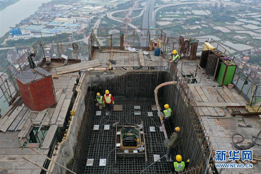 3月18日,施工人員在廣州南沙港鐵路跨西江斜拉橋東主塔進(jìn)行封頂施工(無人機(jī)照片)。新華社記者劉大偉攝