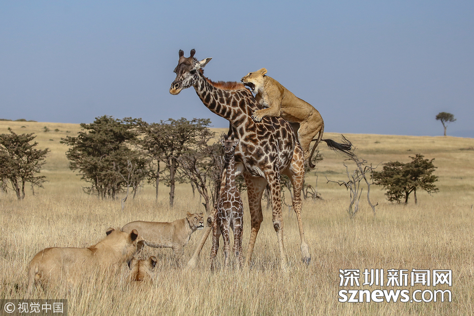 當?shù)貢r間2018年8月15日,肯尼亞馬賽馬拉,當?shù)貙в握材匪埂ぜ{帕索(James Nampaso)拍攝到一群獅子圍攻母長頸鹿和她的幼崽。盡管長頸鹿勇敢地抵抗獅群的進攻,但當一頭母獅跳上它的脊背時,它被分散了注意力,使得獅群最終捕獲了它的孩子。