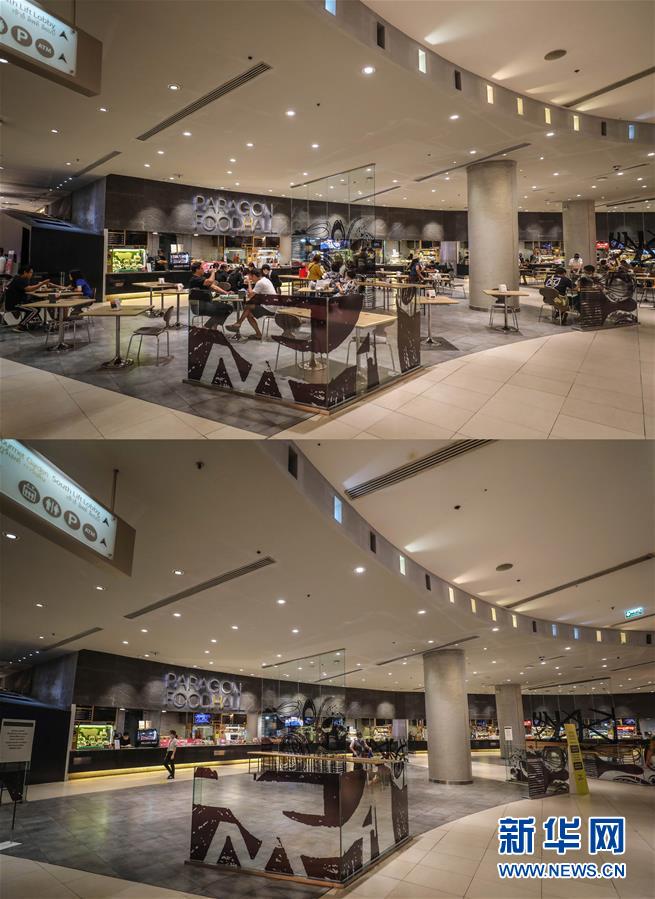 這是3月21日拍攝的泰國曼谷暹羅百麗宮商場負一層的美食城(上圖)和3月22日拍攝的美食城對比圖。商場除了負一層的美食城和超市外,全部關(guān)閉。美食城只對顧客提供外賣服務。新華社記者張可任攝