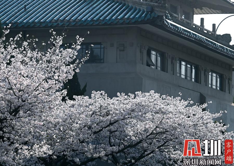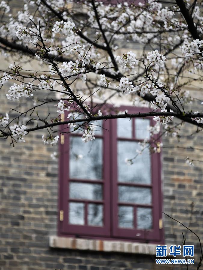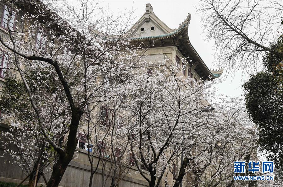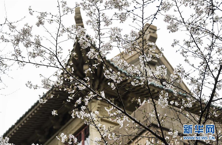 近日,隨著氣溫上升,武漢大學圖書館附近一片櫻花開放。新華社記者費茂華攝