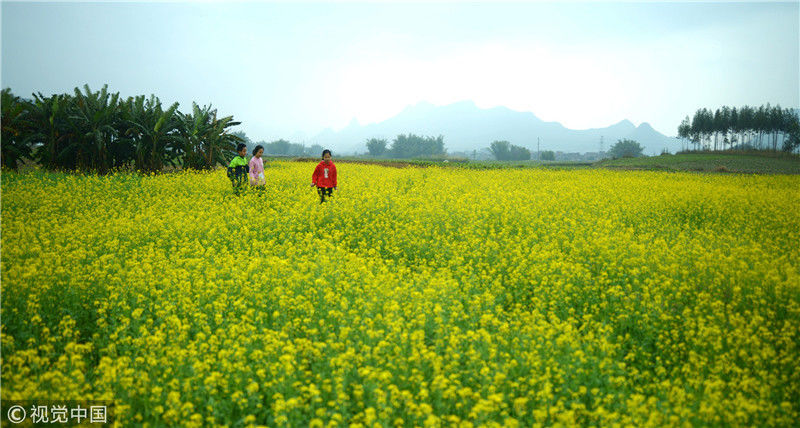 2019年2月5日,廣西來賓,當(dāng)天是農(nóng)歷大年初一,人們在忻城縣城關(guān)鎮(zhèn)隆光村油菜花海中賞花游玩。