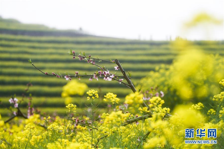 3月25日,新登鎮(zhèn)上旺村黑山頂?shù)挠筒嘶êEc桃花相互映襯。新華社記者徐昱攝