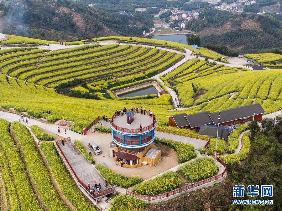 3月25日,游客在新登鎮(zhèn)上旺村黑山頂觀景臺(tái)觀賞油菜花海(無(wú)人機(jī)照片)。新華社記者徐昱攝