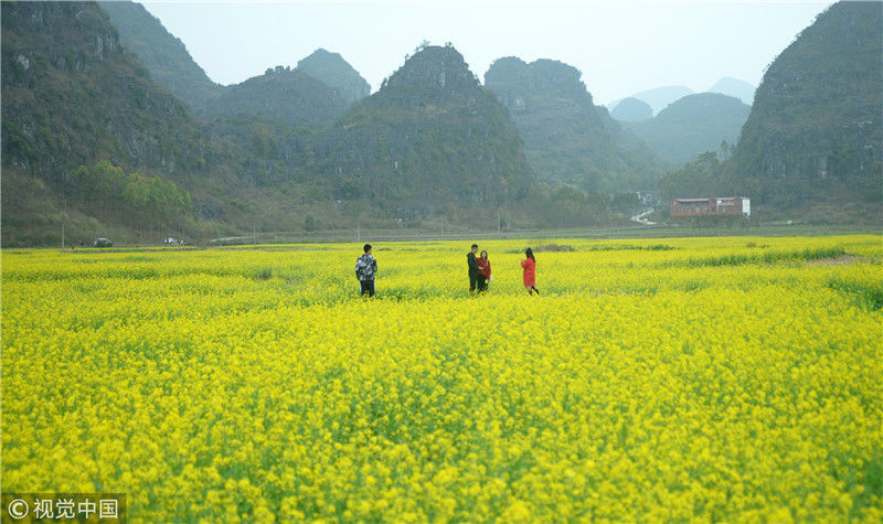 2019年2月5日,春節(jié)期間,廣西來(lái)賓市忻城縣萬(wàn)余畝油菜花競(jìng)相綻放,吸引眾多游客前來(lái)賞花游玩,感受春天的氣息。近年來(lái),廣西忻城縣大力實(shí)施鄉(xiāng)村振興戰(zhàn)略,注重發(fā)展鄉(xiāng)村旅游產(chǎn)業(yè),把鄉(xiāng)村旅游與美麗鄉(xiāng)村、脫貧攻堅(jiān)緊密結(jié)合起來(lái),輻射帶動(dòng)當(dāng)?shù)刎毨裘撠氈赂?。樊紹光/視覺(jué)中國(guó)