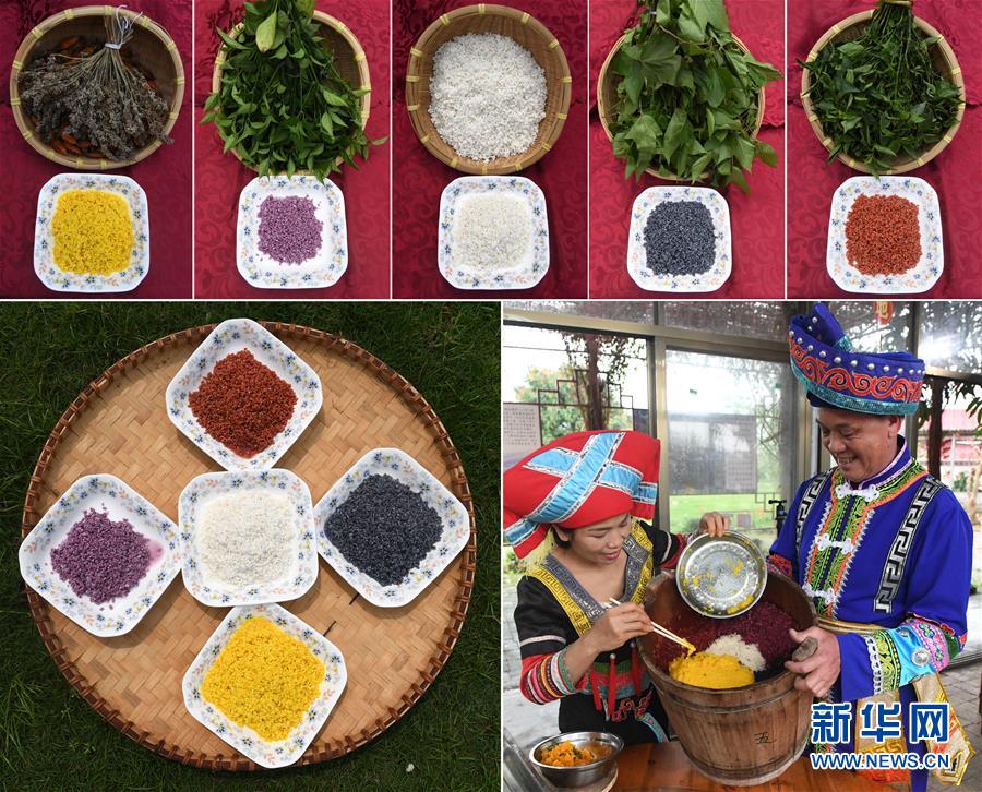 上五圖:4種不同植物及其色素染成的糯米和原色糯米;下左圖:4種不同植物色素染成的糯米和原色糯米;下右圖:在廣西上林縣巷賢鎮(zhèn),兩名壯族村民在查看一桶剛剛蒸熟的五色糯米飯(拼版圖片,3月25日攝)。每年“壯族三月三”到來之際,廣西的壯族同胞都有蒸制五色糯米飯迎接節(jié)日的習俗,以祈禱五谷豐登,五福臨門。這些五色糯米飯,主要采用天然植物萃取色素,將糯米分別浸泡到紫、黃、紅、黑4種不同植物色素的水里,充分染色后,與原色糯米一起蒸熟而成。色澤鮮艷、清香誘人的五色糯米飯,是“壯族三月三”接待來客時必不可少的傳統(tǒng)美食。新華社記者陸波岸攝