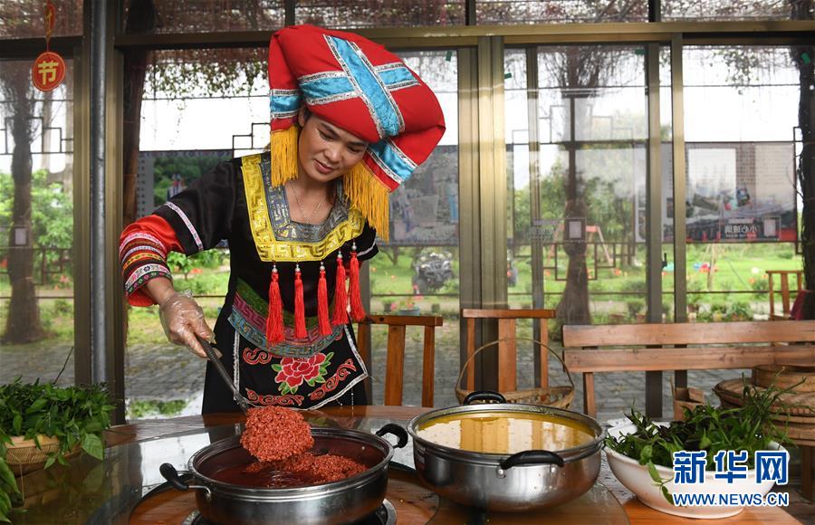 4月16日,在貴州省臺江縣姊妹街哆蝶五彩姊妹飯體驗店,苗家婦女在制作五彩“姊妹飯”。新華社發(fā)(劉開福攝)