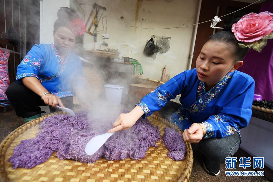 4月17日,在貴州省臺江縣姊妹街哆蝶五彩姊妹飯體驗店,苗家婦女將蒸熟的五彩“姊妹飯”進行攤晾。新華社記者楊文斌攝