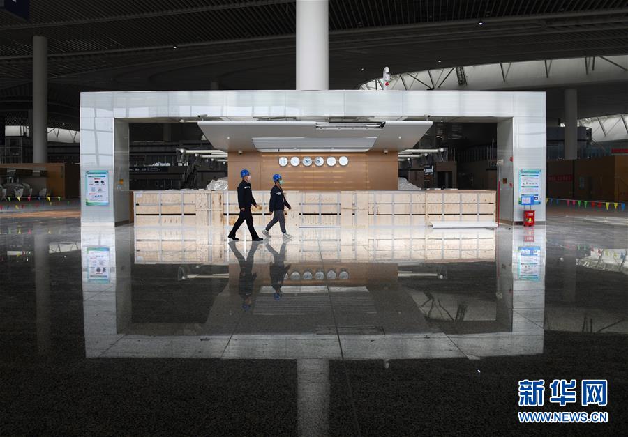 3月25日,兩名工程技術(shù)人員從建設(shè)中的青島膠東國(guó)際機(jī)場(chǎng)航站樓出發(fā)大廳走過。新華社記者李紫恒攝