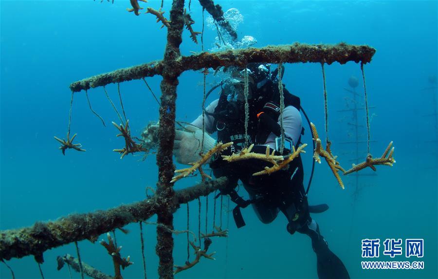 3月28日,在位于海南三亞蜈支洲島旅游區(qū)的海洋牧場,工作人員在清理附著在珊瑚上的漁網(wǎng)。近日,位于海南三亞蜈支洲島旅游區(qū)的海洋牧場復(fù)工,海底作業(yè)逐漸恢復(fù)正常,開始進(jìn)行人工魚礁吊裝擺位、水下監(jiān)控清理以及日常巡護(hù)等工作。據(jù)介紹,人工魚礁有利于魚類種類增加和數(shù)量提高,蜈支洲島海域海洋牧場人工魚礁表面附著珊瑚、貝類、藻類等生物種類達(dá)120余種。新華社記者楊冠宇攝