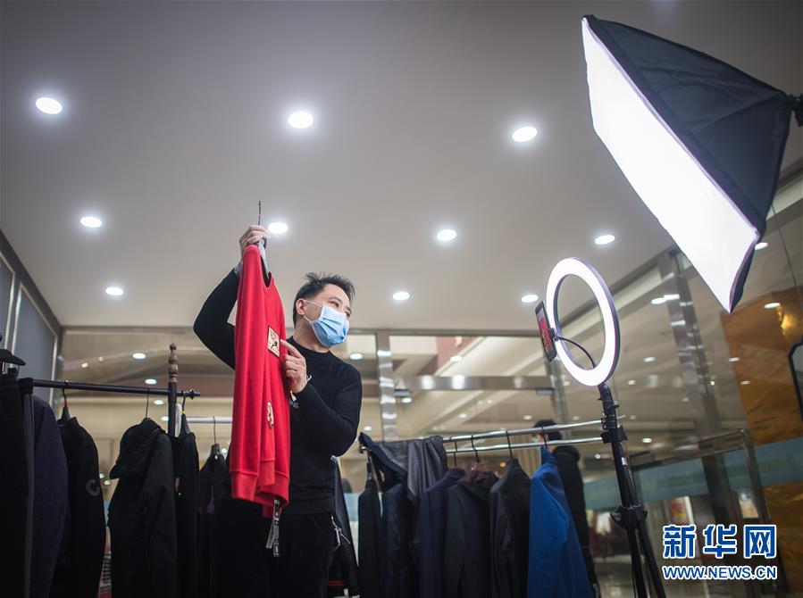 3月29日,在漢口北市場(chǎng),主播在直播平臺(tái)直播銷(xiāo)售一款服裝。新華社記者肖藝九攝