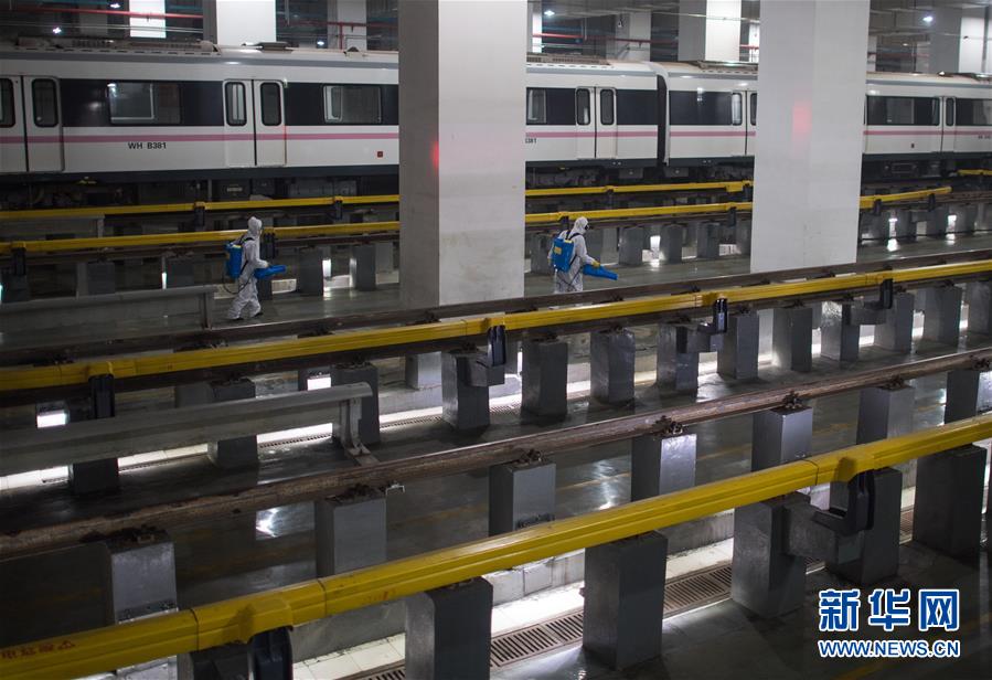 3月23日,在武漢地鐵常青車(chē)輛段,保潔人員在消毒。新華社記者肖藝九攝
