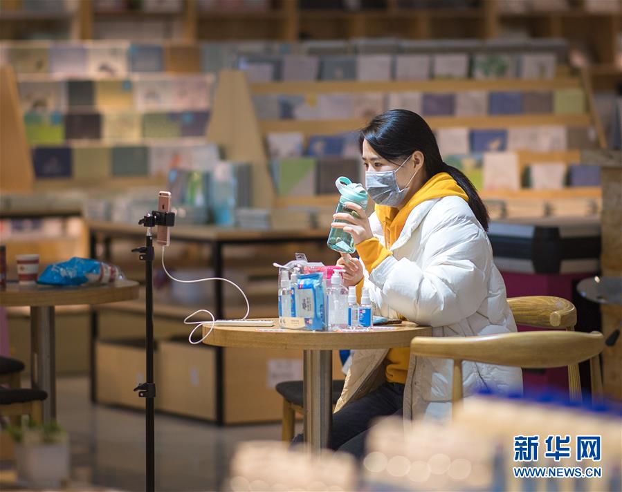 3月29日,在漢口北市場(chǎng),一名主播在直播平臺(tái)直播銷(xiāo)售床上用品。新華社記者肖藝九攝