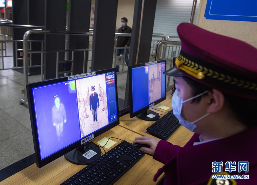 3月23日,在漢口火車(chē)站地鐵站,工作人員在測(cè)試測(cè)溫系統(tǒng)。該車(chē)站的2個(gè)入口處,已經(jīng)安裝了電子測(cè)溫儀器,只要有乘客通過(guò),就會(huì)在電腦顯示屏上出現(xiàn)體溫的數(shù)據(jù),監(jiān)控進(jìn)站乘客體溫。新華社記者肖藝九攝