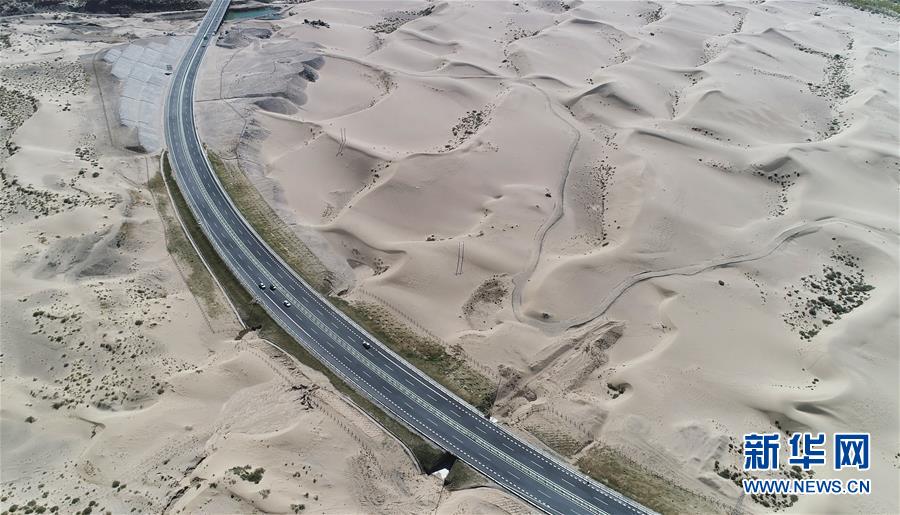 汽車行駛在第一條沙漠公路上(6月12日無(wú)人機(jī)拍攝)。新華社記者趙戈攝