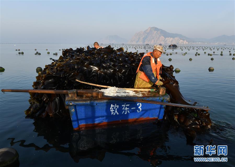海島居民們?cè)陴B(yǎng)殖區(qū)收割海帶(5月24日攝)。新華社記者朱崢攝