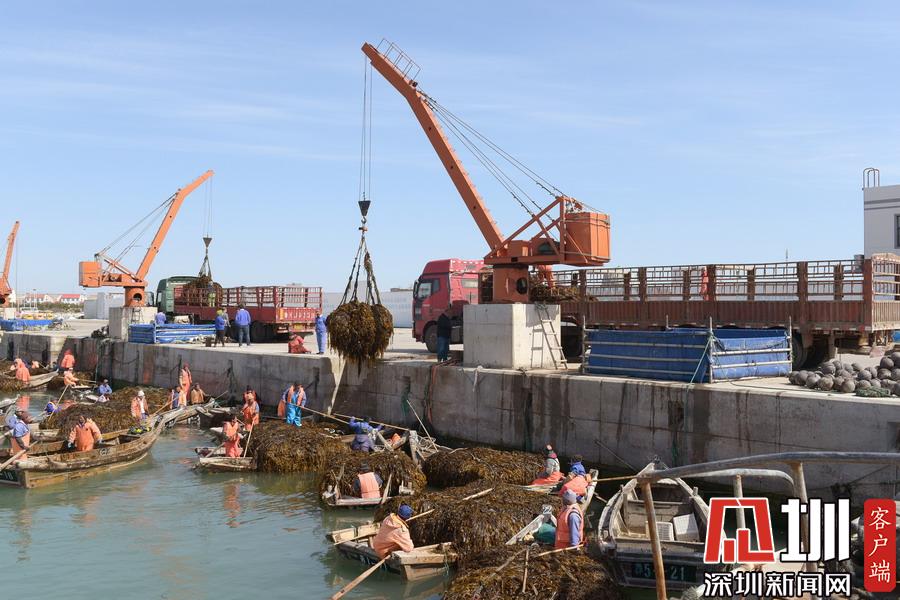 2020年3月29日,山東威海,榮成市愛連灣海水養(yǎng)殖區(qū)域,養(yǎng)殖工人開始收割海帶。