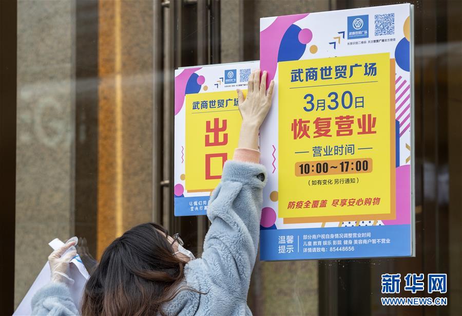 3月30日,在武商世貿(mào)廣場,工作人員在開門前布置標(biāo)志牌。當(dāng)日,武漢市多家商場開門迎客。新華社記者費(fèi)茂華攝
