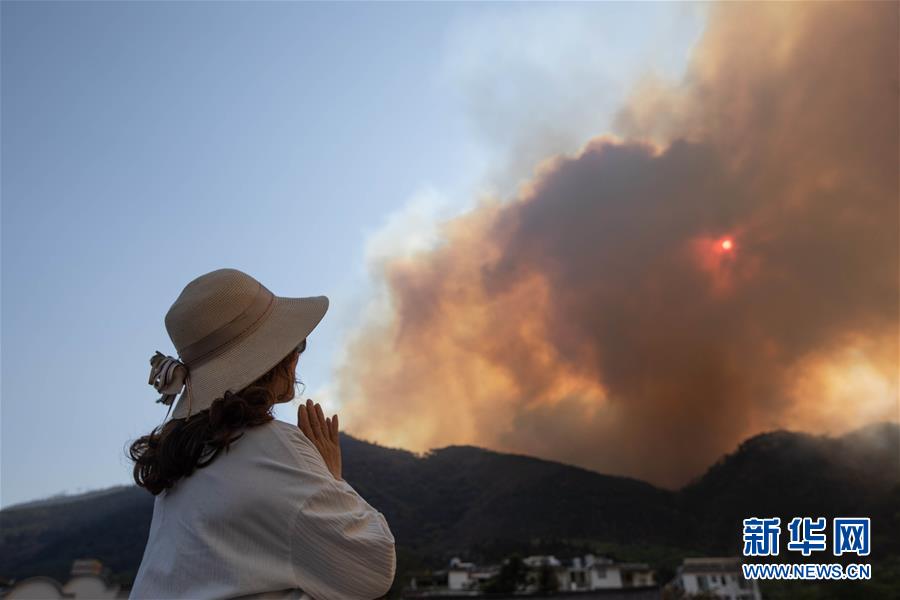 3月31日,一名女士遠望著火災現(xiàn)場祈禱。新華社記者江宏景攝
