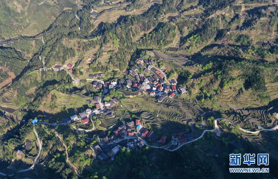這是融水苗族自治縣桿洞鄉(xiāng)小河村高羽苗寨的木樓和梯田(3月31日攝,無人機照片)。隨著氣溫逐漸轉暖,廣西融水苗族自治縣桿洞鄉(xiāng)的苗寨梯田景色迷人,美如畫卷。新華社記者黃孝邦攝