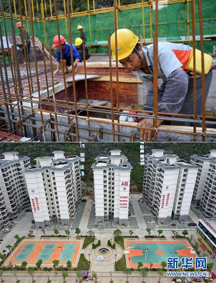 拼版照片:上圖為工人在廣西都安瑤族自治縣八仙易地扶貧搬遷安置新區(qū)項目施工(2016年7月25日攝);下圖為已經建成入住的廣西都安瑤族自治縣八仙易地扶貧搬遷安置新區(qū)部分樓房(無人機照片,2019年10月16日攝)。新華社記者陸波岸攝