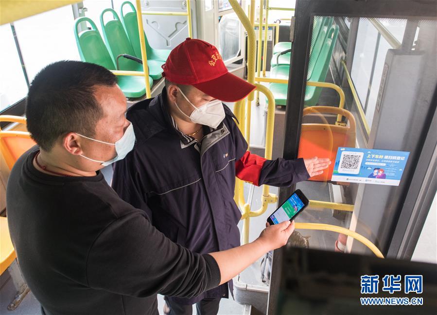 3月23日,在武昌火車站公交車總站,工作人員測試掃碼登記系統(tǒng)。新華社記者肖藝九攝