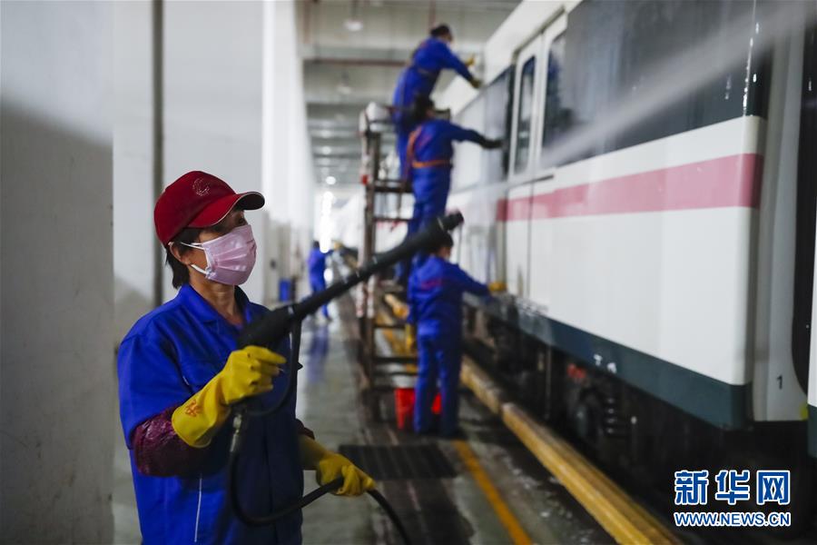 3月23日,在武漢地鐵常青車輛段,保潔人員清洗地鐵列車。新華社記者沈伯韓攝