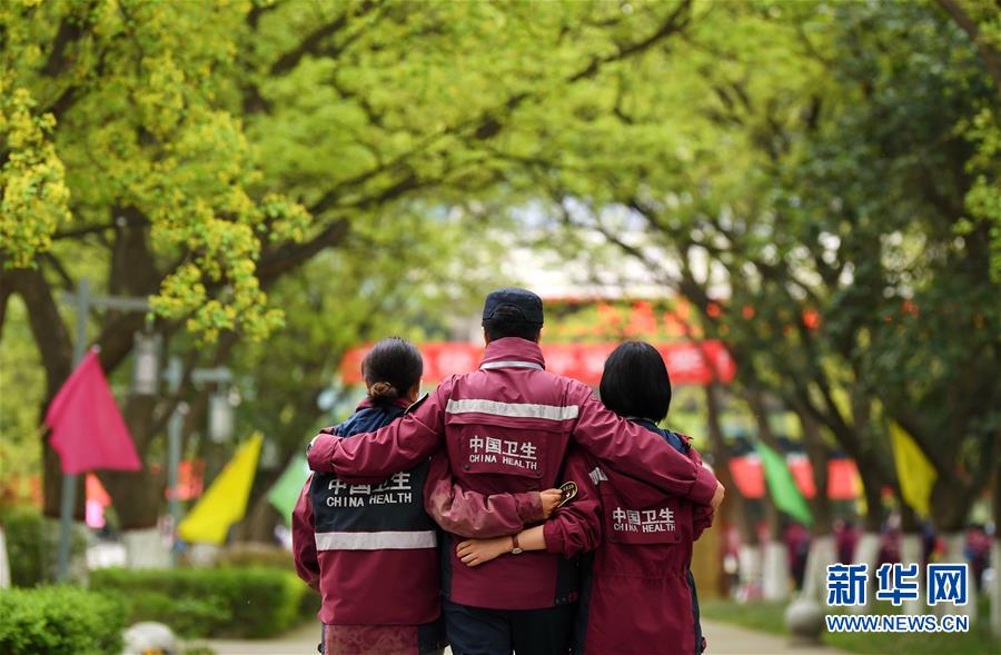 4月3日,陜西省第一批援鄂醫(yī)療隊隊長易智(中)安慰離別的隊員。 當(dāng)日,陜西省第一批援鄂醫(yī)療隊137名隊員在陜西省工人療養(yǎng)院結(jié)束了為期兩周的隔離休養(yǎng)。醫(yī)療隊員與“戰(zhàn)友”深情作別后,陸續(xù)踏上歸途。 新華社記者 李一博 攝