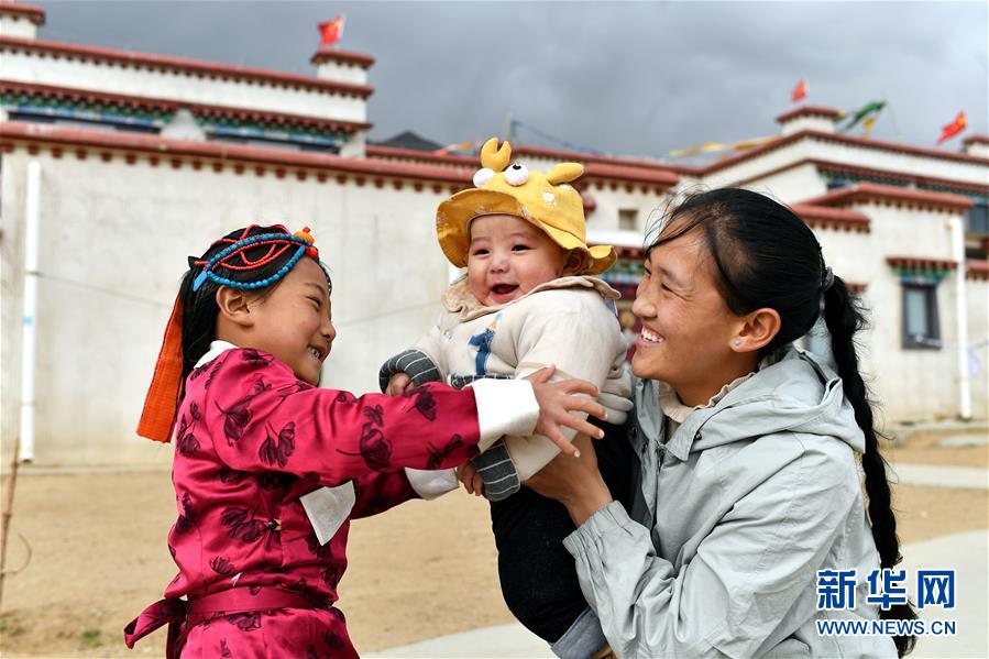 在拉薩市堆龍德慶區(qū)古榮鄉(xiāng)榮瑪高海拔生態(tài)搬遷點(diǎn),美瓊(左一)和孩子們?cè)诩议T口玩耍(4月1日攝)。美瓊一家在搬遷點(diǎn)分到一套120平米的房子。美瓊還和朋友合伙在搬遷點(diǎn)的扶貧綜合門面房租了一間店面,開了一家銷售日用品的小商店。新華社記者 詹彥 攝