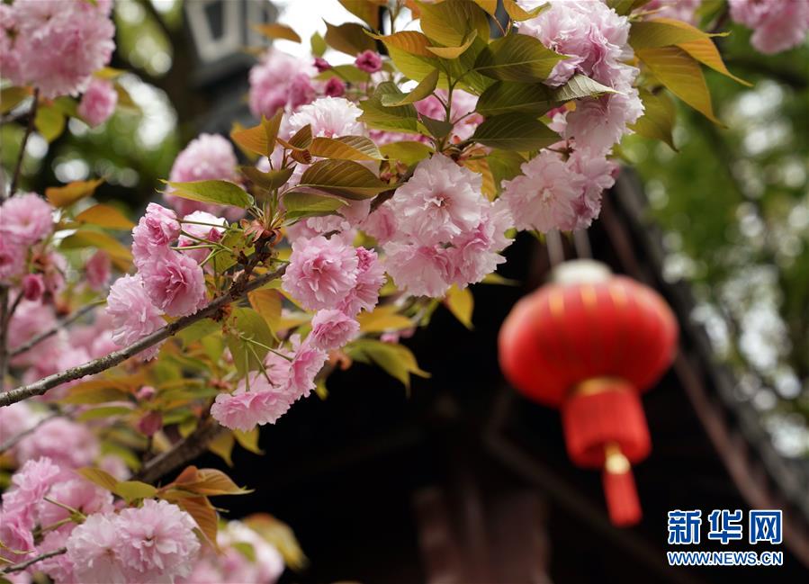 在位于上海松江的江南古典園林——醉白池,晚櫻盛放(4月6日攝)。  新華社記者 劉穎 攝