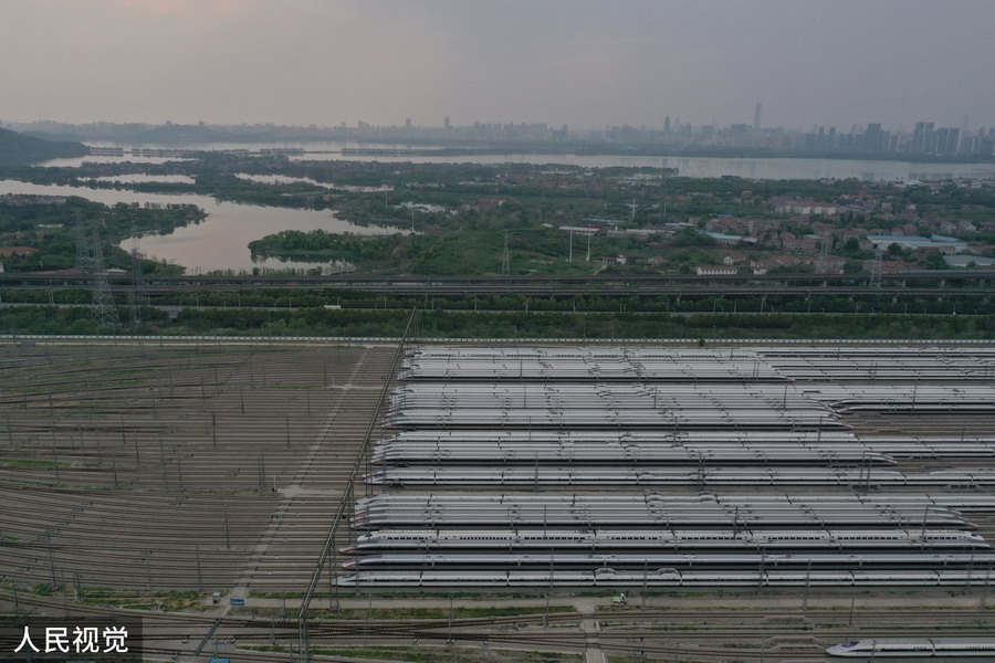 2020年4月6日,武漢動(dòng)車段高鐵動(dòng)車組整裝待發(fā)(無(wú)人機(jī)照片)。
